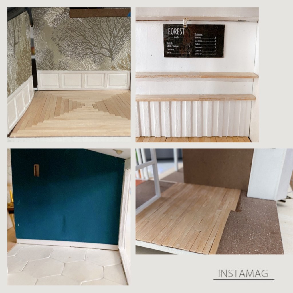 Another trick is switching up the materials. Remember how I mentioned the wallpaper and floor paper? You can not only change the color but also the texture. I swapped out the floor paper for a wood material to give it a more realistic vibe. For the wallpaper, I went with thicker paper in a deep blue for the bathroom and used floral tissue paper for the bedroom walls. I even made a double layer for the bedroom walls, with floral tissue on top and a white wall decor pattern below. Adding those little details really changes up the look of a mini-house. See the below picture for better ideas.